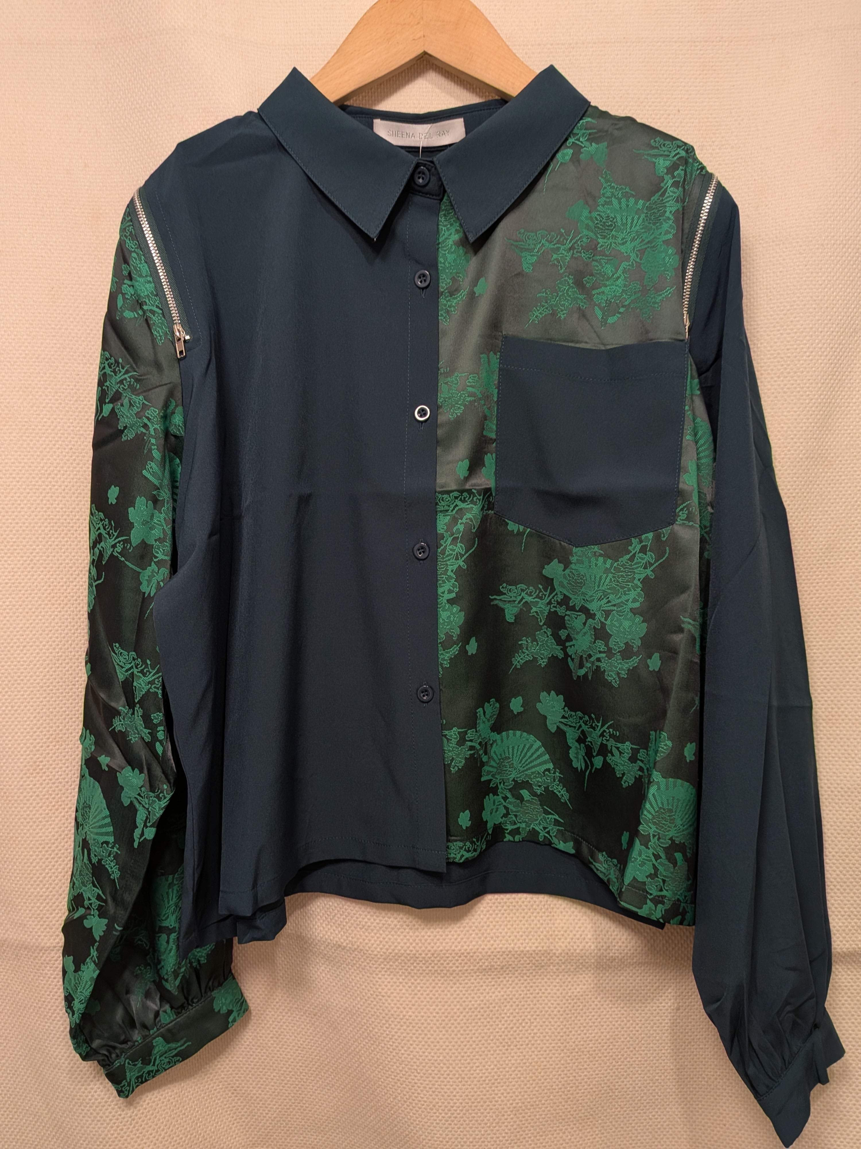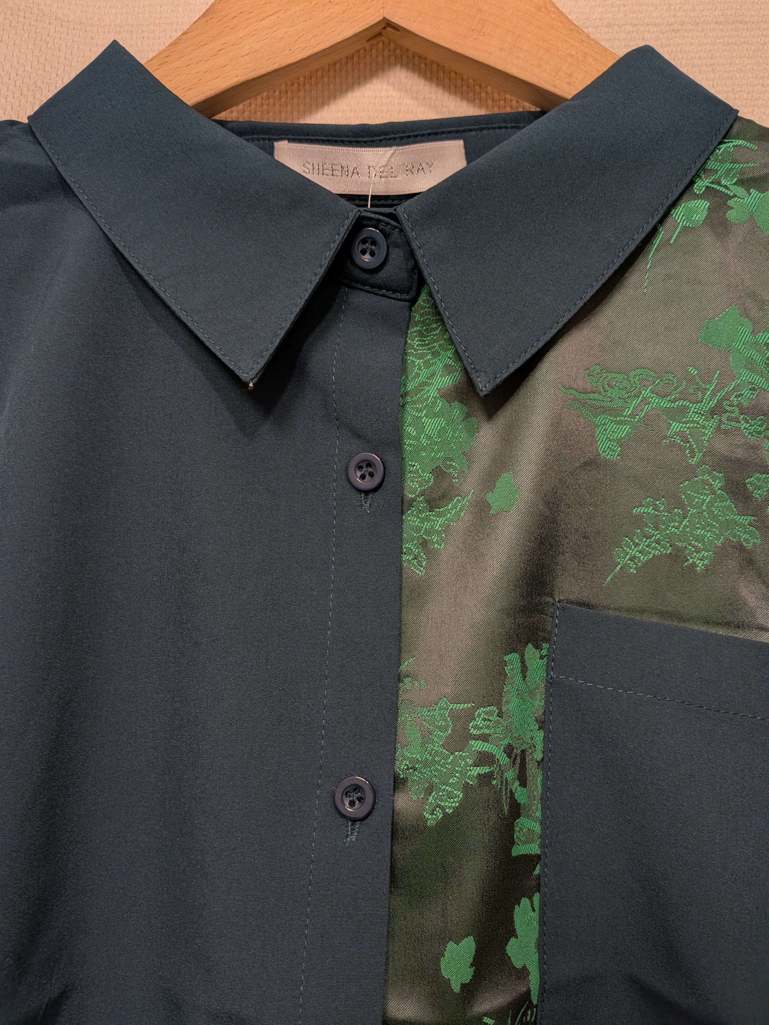 緑のコントラストが美しい、アシンメトリーデザインのシャツです。