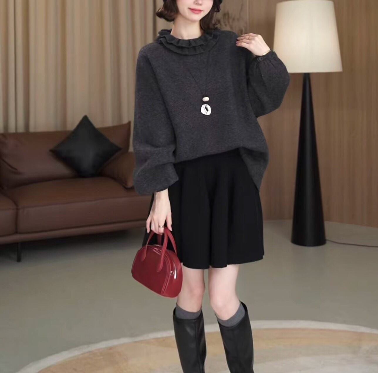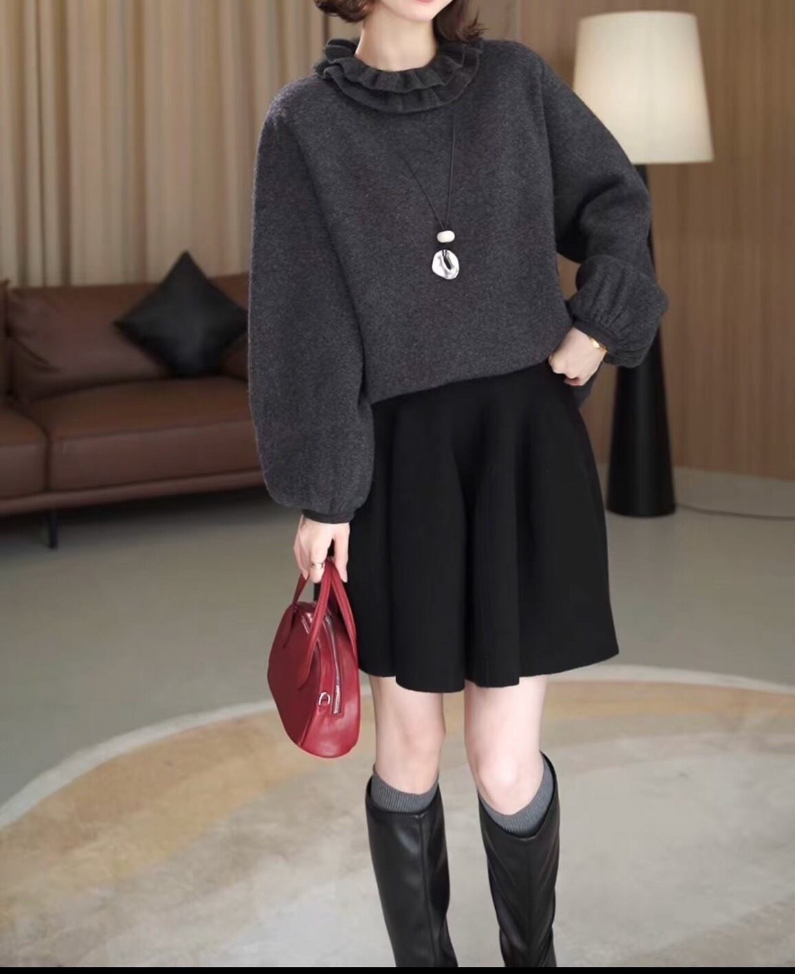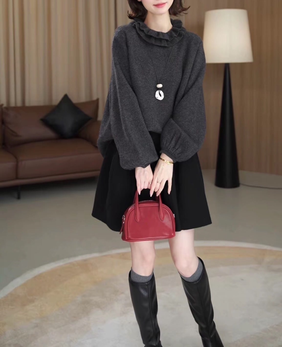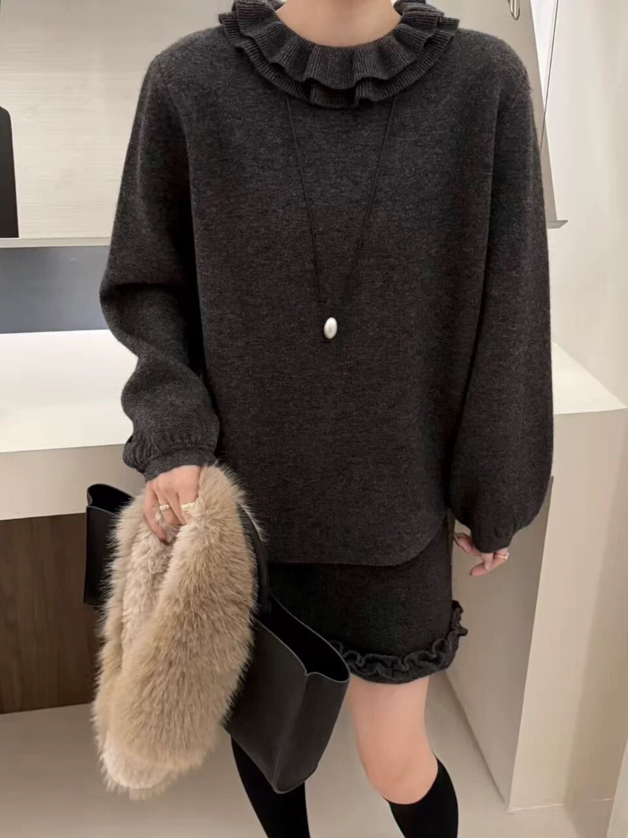 フリルネックニット チャコールグレー