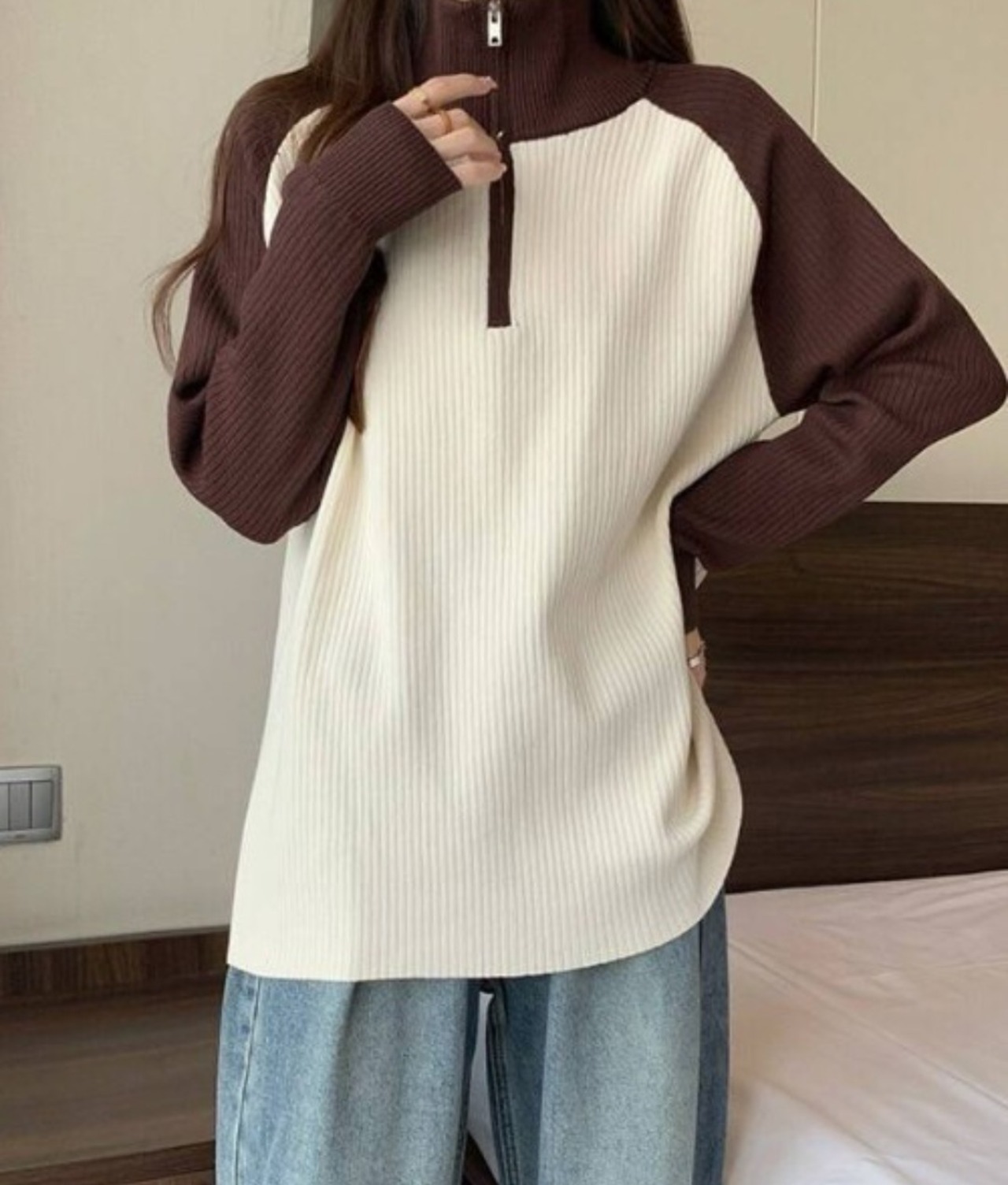 ハーフジップニットトップス ブラウン
