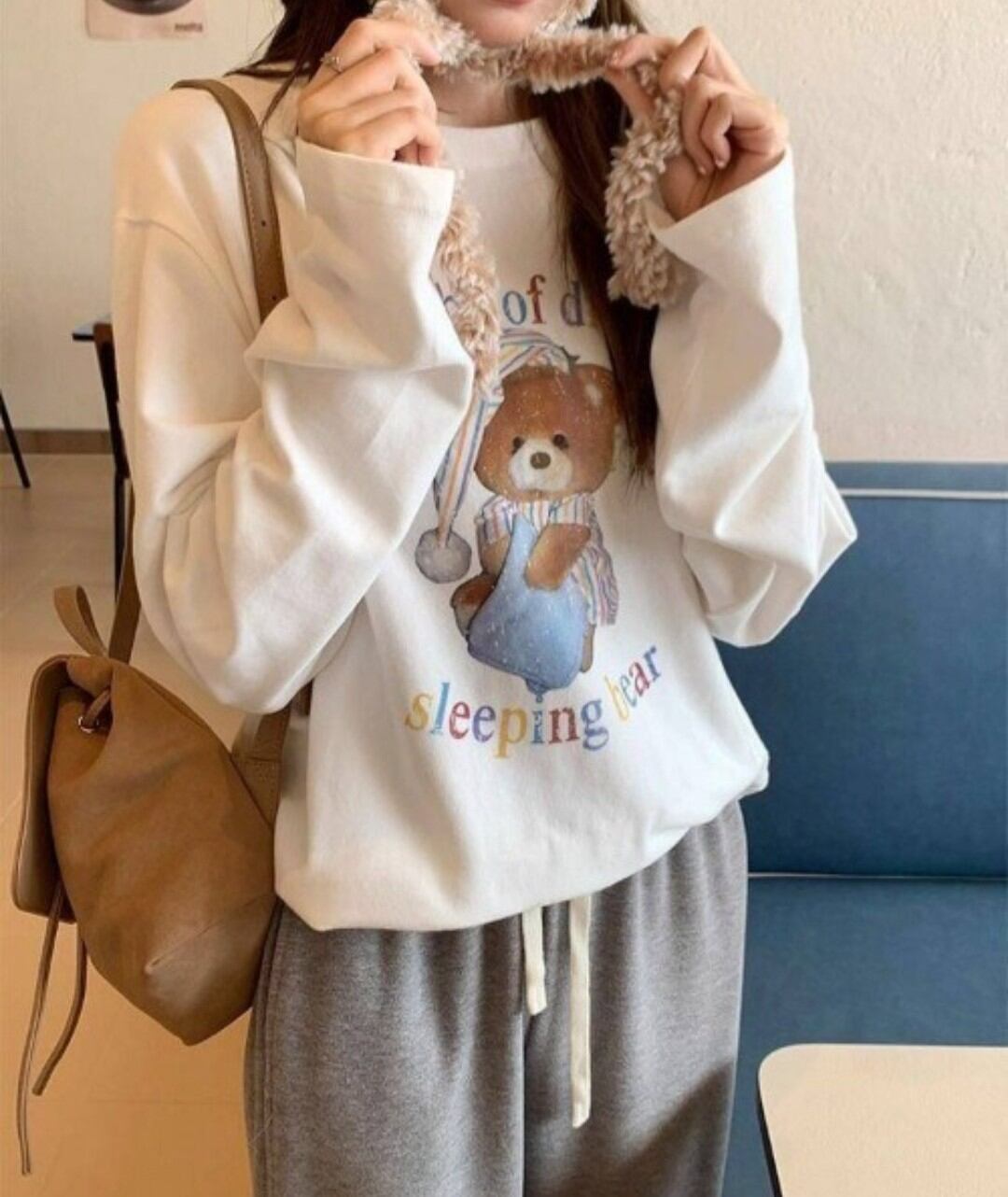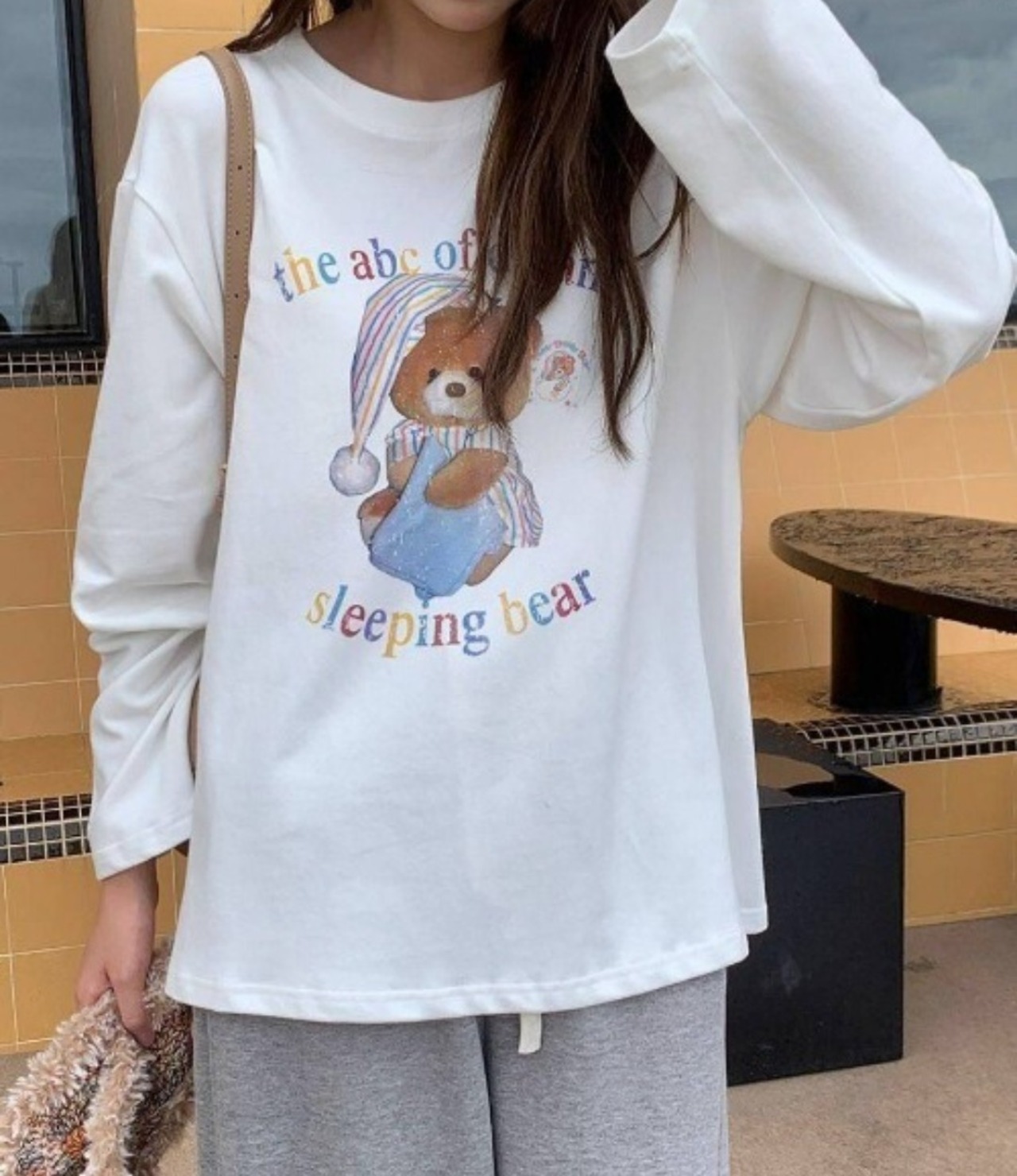 スリーピングベアー長袖Tシャツは、愛らしいクマのデザインが特徴の可愛い一着です!リラックスしたシルエットで、カジュアルさをしっかりキープしつつも、おしゃれ感も演出。流行の長袖スタイルで、季節を問わず楽しめるアイテムです!スリーピングベアーのデザインがあなたのファッションに癒しをプラスします!